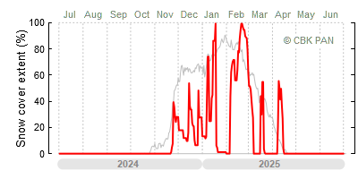 We would call a winter "harsh" if snow cover persisted for a long time and covered the largest possible area of the country. An example of such a situation in Poland is the winter of 2005/06, when snow covered almost the entire country from mid-December until the end of April. This significantly impacted the average for the entire year—statistically, on each day between July 1, 2005, and June 30, 2006, snow cover extended over as much as one-third of Poland!