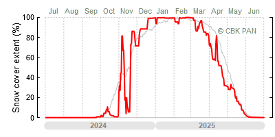 We would call a winter "harsh" if snow cover persisted for a long time and covered the largest possible area of the country. An example of such a situation in Poland is the winter of 2005/06, when snow covered almost the entire country from mid-December until the end of April. This significantly impacted the average for the entire year—statistically, on each day between July 1, 2005, and June 30, 2006, snow cover extended over as much as one-third of Poland!