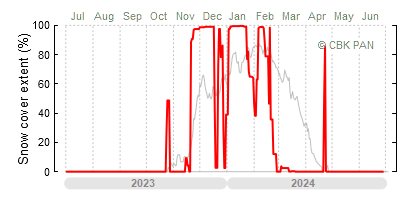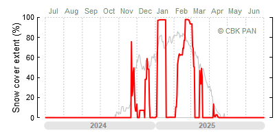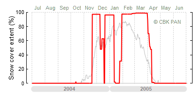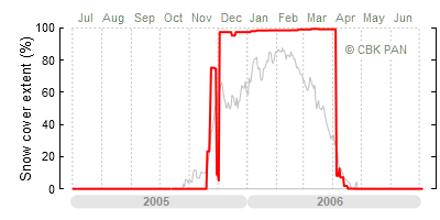 We would call a winter "harsh" if snow cover persisted for a long time and covered the largest possible area of the country. An example of such a situation in Poland is the winter of 2005/06, when snow covered almost the entire country from mid-December until the end of April. This significantly impacted the average for the entire year—statistically, on each day between July 1, 2005, and June 30, 2006, snow cover extended over as much as one-third of Poland!