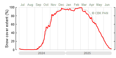 We would call a winter "harsh" if snow cover persisted for a long time and covered the largest possible area of the country. An example of such a situation in Poland is the winter of 2005/06, when snow covered almost the entire country from mid-December until the end of April. This significantly impacted the average for the entire year—statistically, on each day between July 1, 2005, and June 30, 2006, snow cover extended over as much as one-third of Poland!